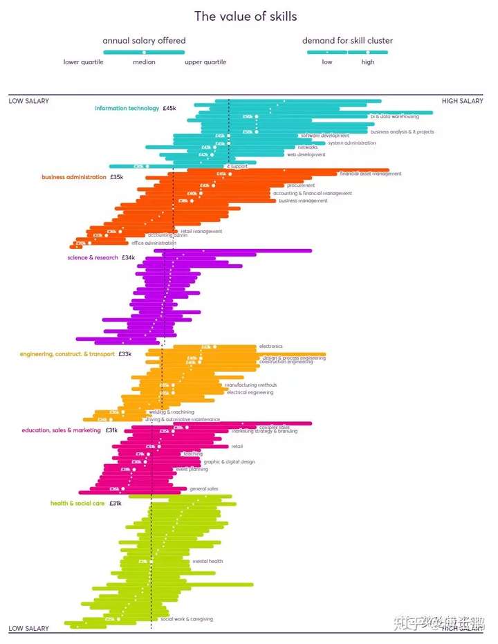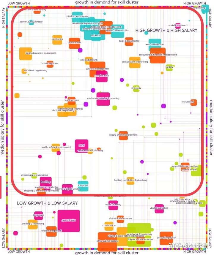 上图显示,目前英国最需要的主要是那些可以完成较难的商业任务、提供科技解决方案、进行科技创新的工种,这些工种同时也是工资最高且最具增长潜力的,位于上图右上方。