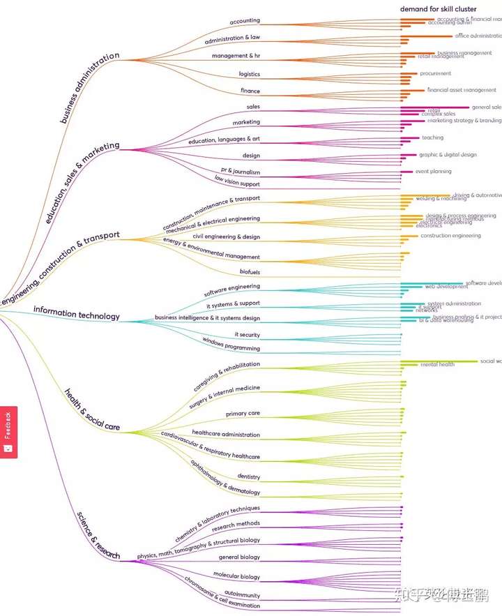 回过头看上边那张密密麻麻的树状图,Nesta其实是把英国所有的工作分成6个比较宽泛的工作种类,并且以工种和技能继续往下分层。